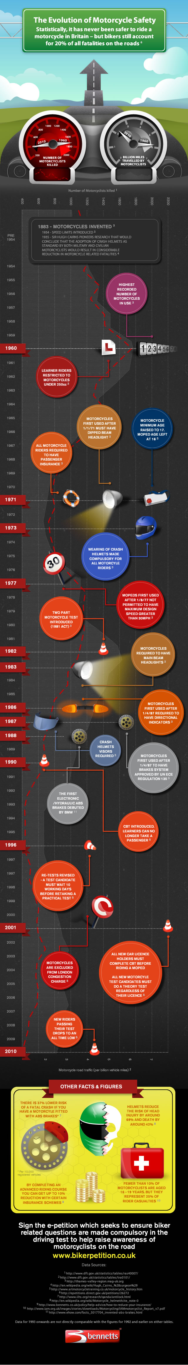 Ever wondered what the different motorcycle safety laws out there are, and how they first came to be? Or how many billions of miles have been driven by motorcycles since the 1960's? Did you know that only recently, it was required to have directional lights on your motorcycle? Well, check out the info graphic below to follow how motorcycle safety laws slowly evolved from the day motorcycles were first invented in 1883 to the present-and remember, always ride safe!